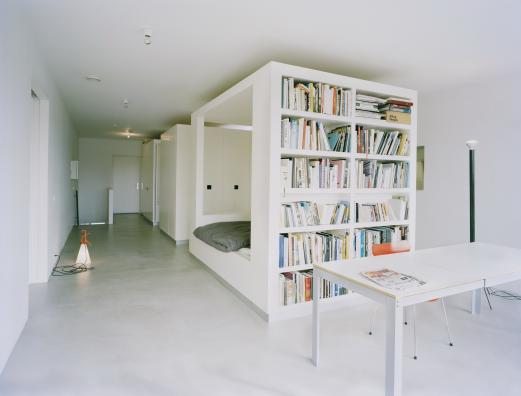 The only things inside the House M&M on the Oostelijke Handelskade in Amsterdam are white cubes: no walls, no rooms, no trafficways. Or perhaps, no rooms, no walls, only trafficways. Each of the four cubes encompasses different functions, serving as a gigantic furnishing that determines the area around it. The first contains a toilet, bath and shower; the second, a wash basin and wardrobe. The third cube envelops a double bed and a bookcase, the fourth cube contains two single beds and a workplace. In this way the function of the area between the cubes is determined: the area between the first and second cubes, or between bath and wash basin, becomes the bathroom. When not in use, however, these areas revert to open space in the dwelling. The volumes of the dwelling are finished in white satin paint. The wet function areas have been treated with a polyurethane coating. On the second level of the dwelling, the cube is revisited in the form of a low-elevation square: the kitchen island, around which all the kitchen functions are arranged.....more
